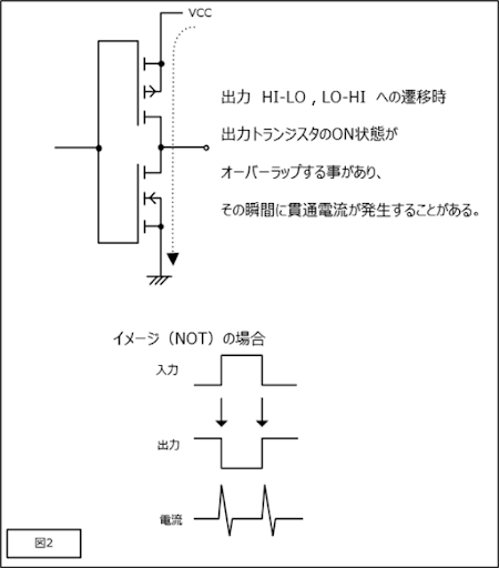 HIの場合、上側のスイッチがON、LOの場合下側のスイッチがONします。デジタル回路のスピードが早くなると非常に短い時間に回路のON/OFF動作することになり、瞬間的に大きな電流の変化が生じます。その典型的な例として、HI-LOもしくはLO-HI遷移時の出力段にオーバーラップが発生し、その瞬間に大きな貫通電流が発生します。