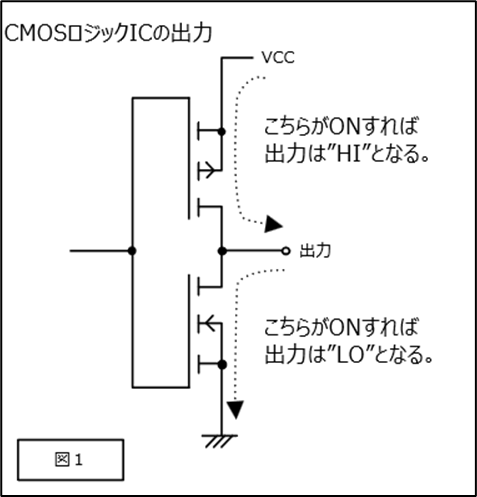 デジタルICの出力は、電源-グラウンド間に接続されたスイッチング素子のON-OFFによってHI-LOを決定します。