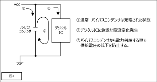 このような事態を回避するため、デジタル回路を設計する際、ICの直近にはパスコンを置くことが推奨されています。具体的には、デジタルICの直近に周波数応答の良いセラミックコンデンサ(バイパスコンデンサ、略してパスコン)を配置し、急な電流変化時にコンデンサよりすかさず電力を供給することで電圧の低下を防ぐことが可能となります。